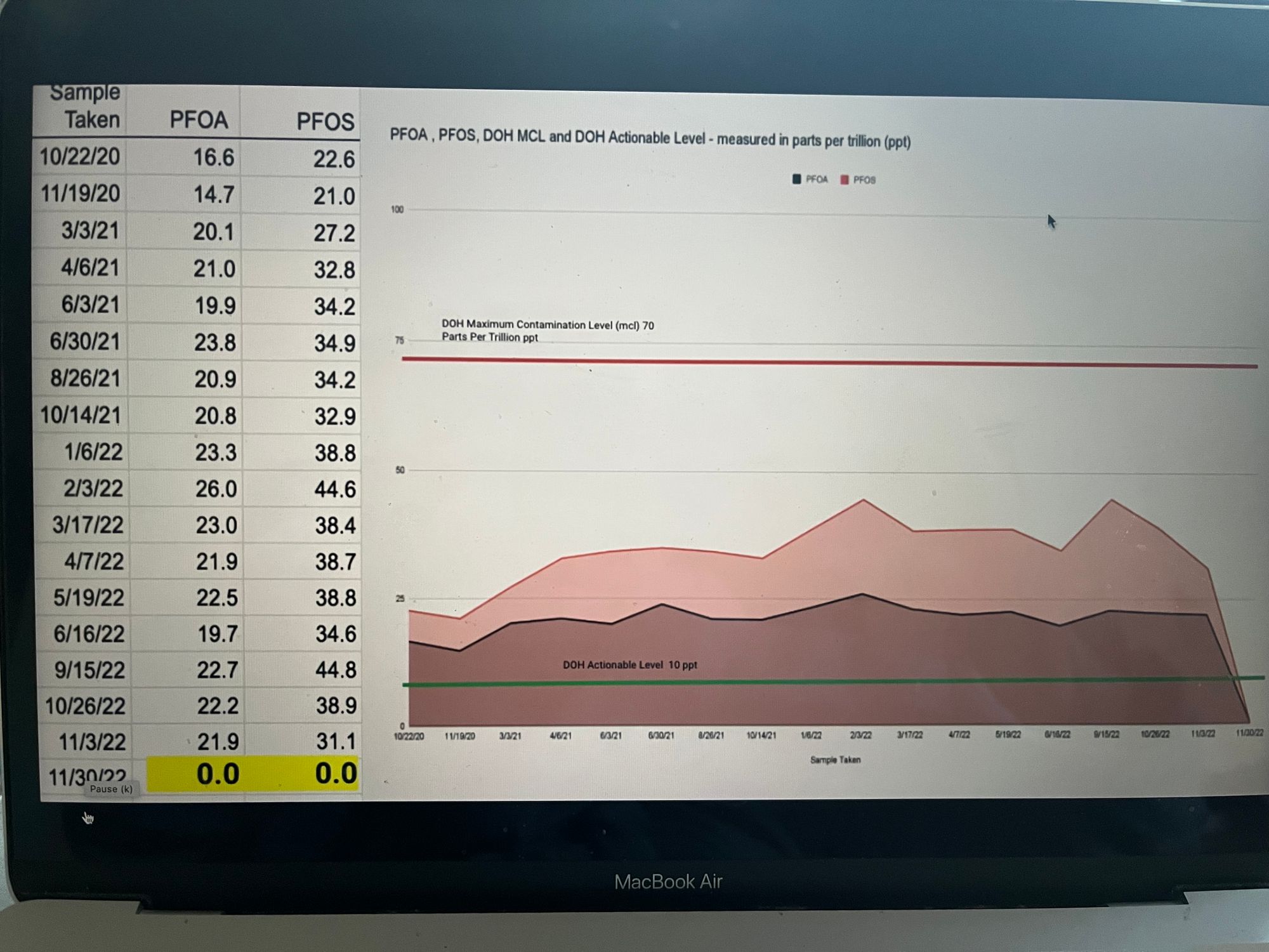 While the disparity in guidance from various jurisdictions is confusing, there are grounds for optimism. After the Putnam Valley Central School District found similar levels of PFAS to that of Town Hall in its elementary school water supply, the staff designed and installed a carbon filtration system. And it works! On February 9th, the district's director of operations and transportation, David Spittal, made a presentation to the school board showing that since that installation, PFAS levels in the school's water have fallen to zero.